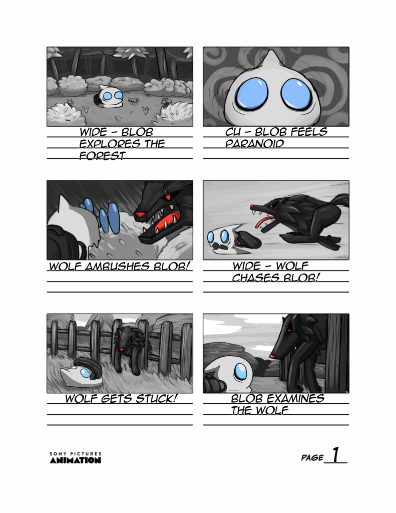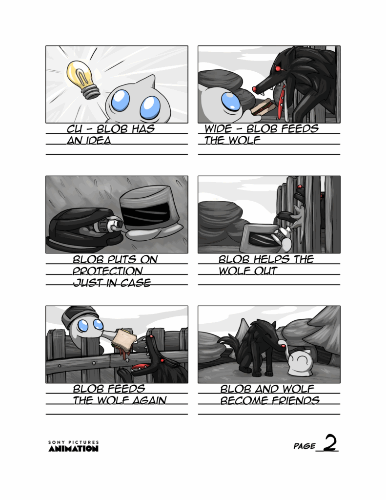 “Blob And Wolf” storyboard practice, as a part of Yellowbrick/Sony Animation’s “This Is Animation” course (2025)